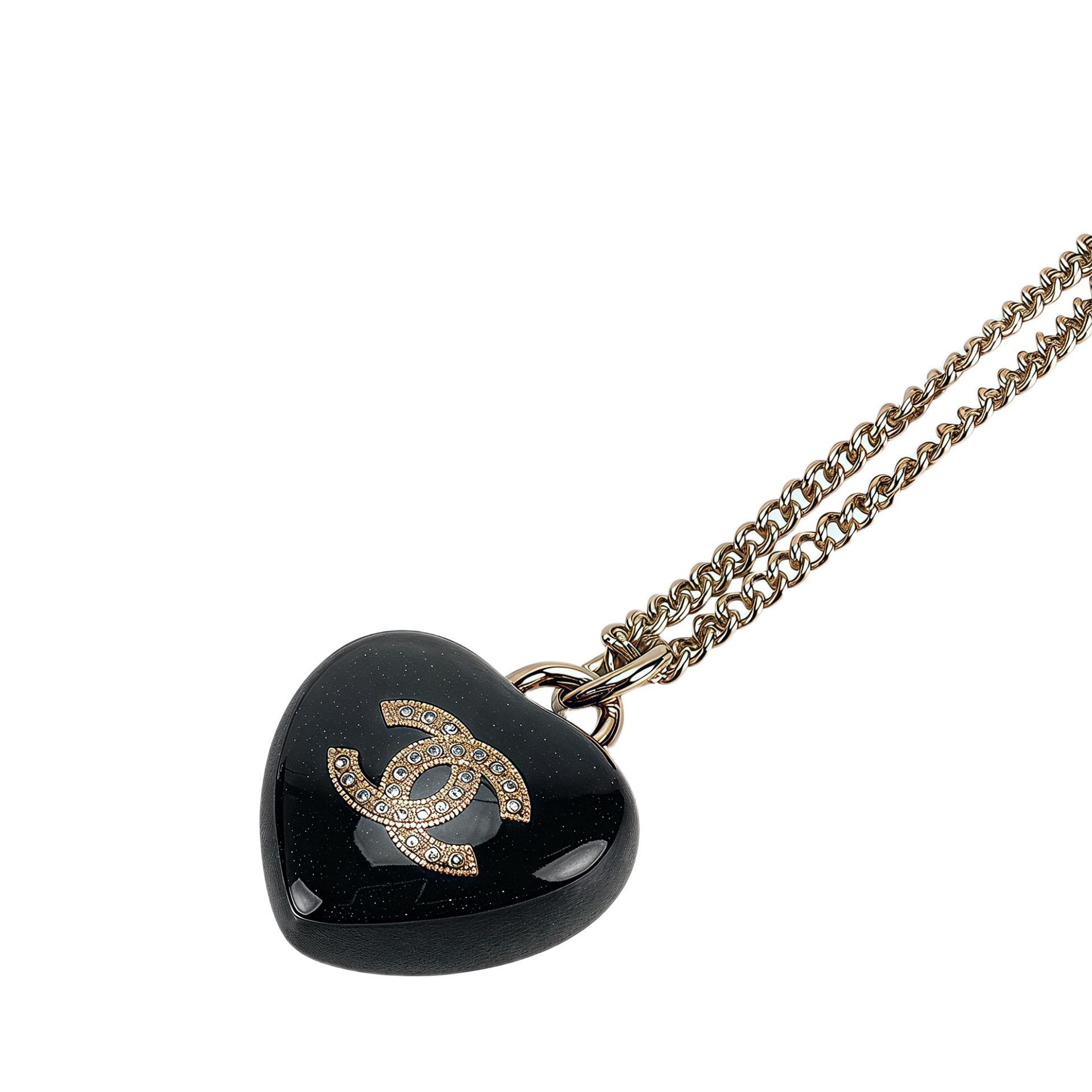 Women’s Gold-Tone Black Resin Heart Pendant Necklace with Full Pavé Diamonds – Delicate Clavicle Chain